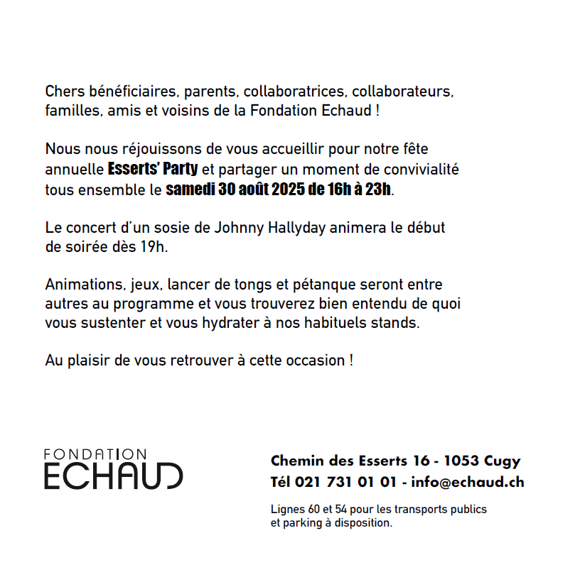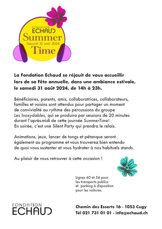 La Fondation Echaud se réjouit de vous accueillir lors de sa Fête annuelle, dans une ambiance estivale, le samedi 31 août 2024, de 14h à 23h !